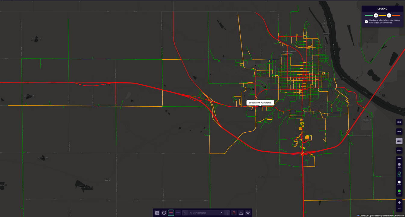 A method to visualize geospatial detection (points and ways) data on maps for analysis and insights. Multiple features for filtering, clustering, and visualization of direction of movement to highlight patterns and potential issues.